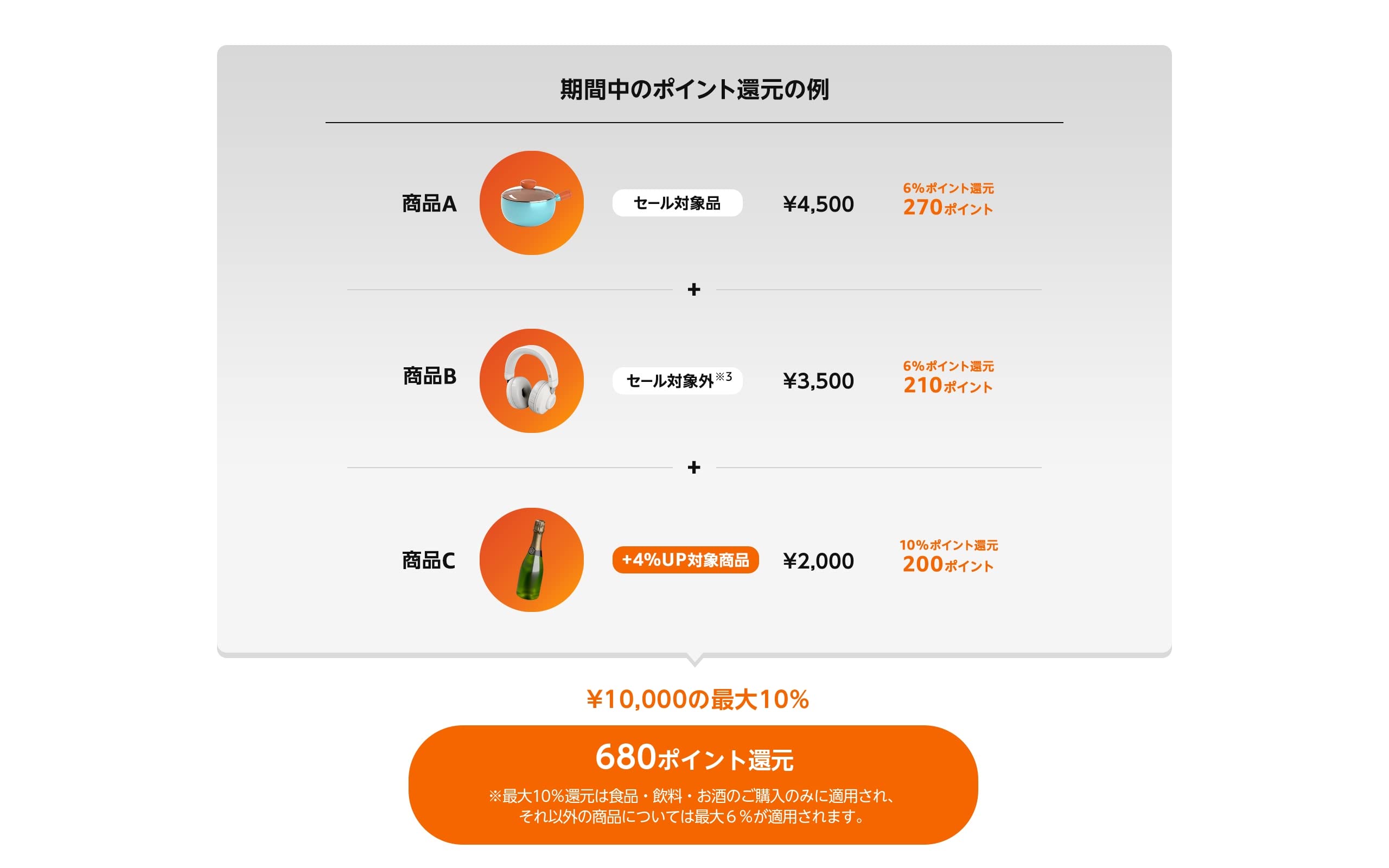 簡単な例でいうと、セール商品でなくても、ビッグセール期間中に合計1万円以上のお買い物をすれば、最大6%の還元があるということです。